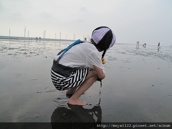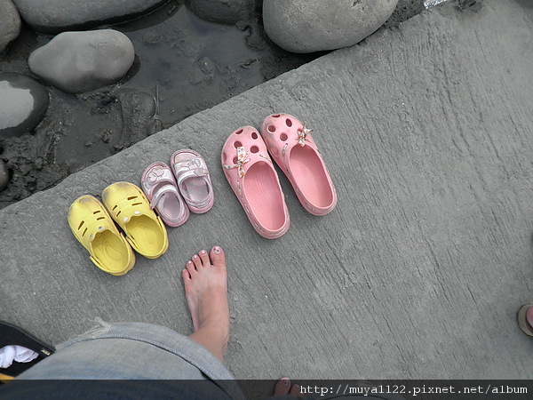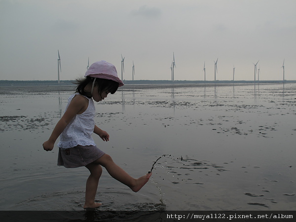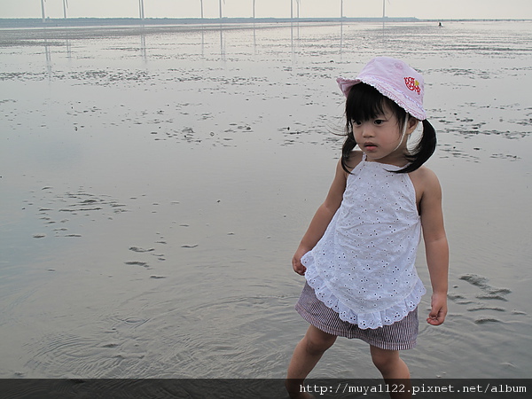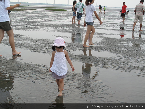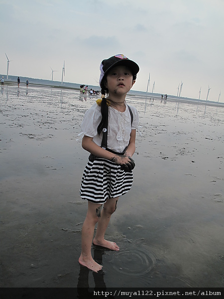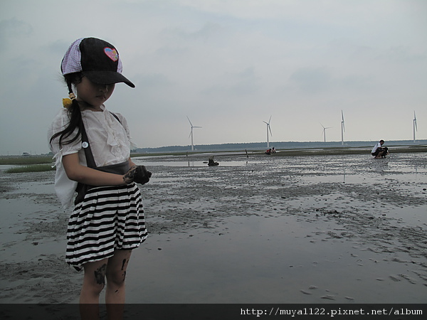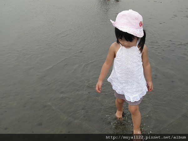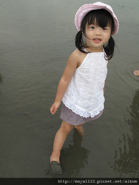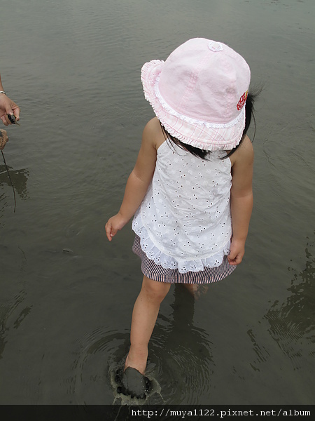 於是她開始亂走、踢水、踢起水中的泥、還用腳挖起泥巴給我們看~~